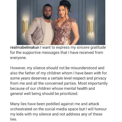 Follow the lengthy post put up on social media regarding the break up of his 20 year old marriage by comedian, actor and filmmaker, Ayo Makun better known as A.Y, his soon-to-be ex-wife, Mabel, has confirmed her husband's news of their divorce. Expressing gratitude for the supportive messages she received, Mabel however stated that her silence over the events leading to her divorce should not be misunderstood. She also emphasized that the father of her children (A.Y.) deserves a certain level of respect and privacy from her and all concerned parties.